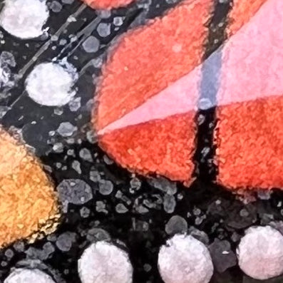 Multiple layers of resin are carefully applied to both the front and back of each piece to enhance durability, add visual depth, and intensify color brilliance. The glossy resin finish magnifies the natural luminosity of the inks while creating a smooth, polished surface. An additional inlay step using a mica powder and resin blend is thoughtfully blocked during curing to prevent bleed-through, resulting in crisp details and a refined finish.
